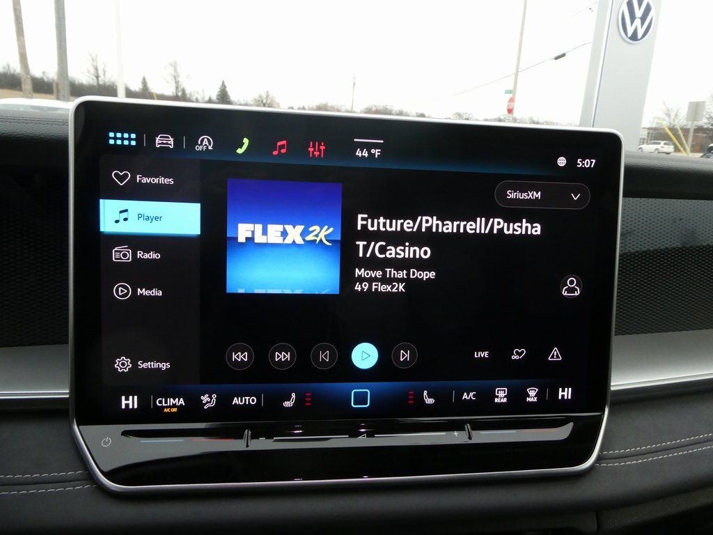 - MIB4 Composition Media Touchscreen w/AM/FM Radio -inc: WMA/MP3/FLAC player w/USB, 12.9" touchscreen multi-function center display w/backlit sliders, voice control, 6 speakers + center speaker (7 speakers total) sound system, capability for in-vehicle 4G LTE enabled Wi-Fi (cellular data plan required; includes limited trial), capability for connected vehicle services (capabilities for services vary; requires enrollment or subscription), Bluetooth® connectivity (for compatible devices), SiriusXM w/360L (w/3-month free trial subscription; 360L services require acceptance of Car-Net terms), App-Connect smartphone integration (w/Apple CarPlay, Android Auto and MirrorLink) via USB, wireless App-Connect smartphone integration (for compatible devices) w/multi-phone pairing capability, 45W fast charging (for compatible mobile phones and accessories) via USB in both rows and Qi wireless inductive charger, cooled, up to 15W (for compatible mobile phones and accessories) All connected vehicle services are subject to terms and limitations. Some services require a paid subscription. See dealer or vw.com/connected for important details.